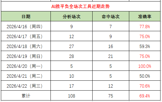 胜平负工具:17场赛事命中12场,准确率70.6%,延续近一周107场命中75场、整体准确率69.4%的稳定表现。